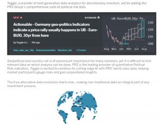 Backed by famed investor Stanley Druckenmiller (who, with George Soros, broke the pound in ’82) and a variety of well-known family offices, global macro asset managers, and computer analytics specialists, Toggle has partnered with The PRS Group – the world’s leader in quant-driven risk analyses and forecasts – to offer something that is truly revolutionary in the connection between political risk and investing.