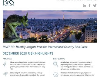 The December 2020 edition of INVESTIR: Insights from the International Country Risk Guide is now available. Opposition side-lined in Nicaragua; Azerbaijan’s president gets a boost; Italy’s confidence votes; post-election happenings in Cote d’Ivoire; a rosy outlook for Australia; and political risk inches lower in Saudi Arabia. Winners and losers in the geopolitical risk game; bullish and bearish calls, and market implications going into 2021. Along with some findings from some recent research using ICRG risk metrics that focuses on the relationship between pandemics, economic inequality and social disorder, as well as public spending and closing the UN’s HDI gap.