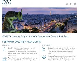 The February 2021 edition of INVESTIR: Insights from the International Country Risk Guide is now available. Possible fuel price intervention in Brazil; Belarus tightens the screws on dissent; Draghi enjoys considerable popular/legislative support (for now); elections and cabinet choices in Cote d’Ivoire; Myanmar’s protests intensify; Sudan devalues; and Egypt taps the international bond markets.