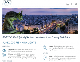 The June 2020 edition of INVESTIR: Insights from the International Country Risk Guide is now available. From Germany’s rising success to Mexico’s deteriorating security and investment climate. Things get interesting in Belarus, as Macron faces a dilemma in Paris. The sustainability of Lebanon’s currency peg is debated. Gabon leaves the distressed debt club, and Sudan’s economy is in a free-fall. Best and worst performers of the month; bullish and bearish calls; our partnerships, and ICRG data now on all major trading platforms. Research that links our data to successful IMF program implementation and to interest rate spreads and borrowing costs during an election.