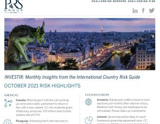 The October 2021 edition of INVESTIR: Insights from the International Country Risk Guide is now available. Investment flows to Canada recede again; Macron’s support inches higher; spiking COVID infections plague parts of Eastern Europe; DRC’s new foreign exchange reserves; opposition gains in South Korea; strained relations between Morocco and Algeria; and Sudan’s power struggle.